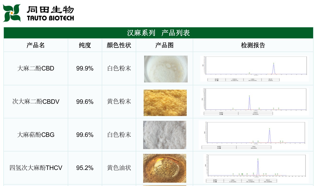 | 內容 | 大麻二酚即CBD,英文名稱:cannabidiol(中文翻譯為大麻二醇或者大麻二酚)是從大麻植物中提取的純天然成分。 大麻二酚分子式為C21H30O2。性狀表現為白色結晶,熔點為66℃~67℃,幾乎不溶于水,溶于乙醇、甲醇、乙醚、苯、氯仿等有機溶劑。 生產地點:云南 年產:十噸級/年 含量:98-99% 提取技術:高速逆流色譜分離純化技術 *此產品目前僅供出口! 漢麻中單體列表: