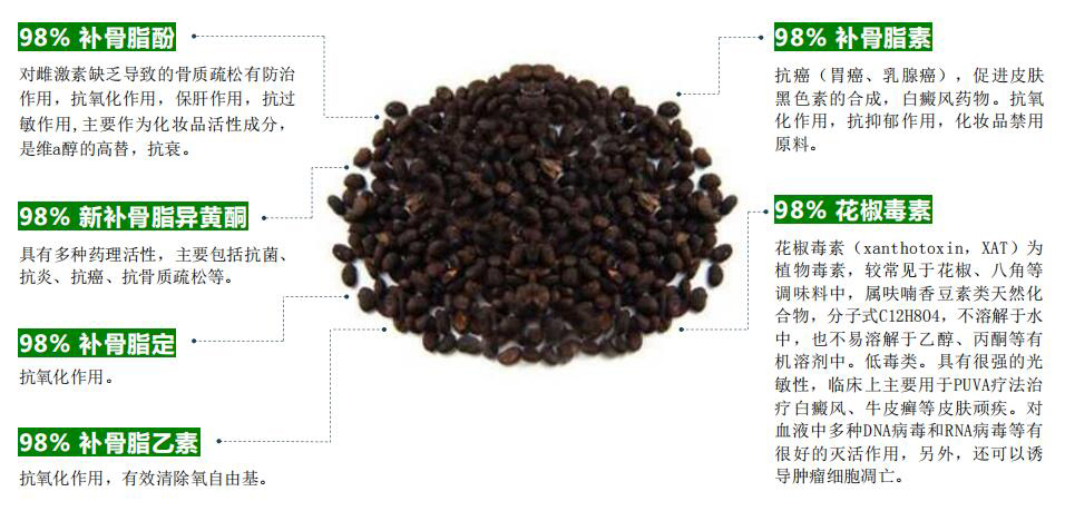 補骨脂素,又稱補骨脂烯、ficusin或manaderm,屬于補骨脂類有機化合物。這些是含有補骨脂素部分的有機化合物,該部分由呋喃與色烯酮稠合為7H-呋喃[3,2-g]色烯-7-酮組成。補骨脂素是一種被稱為線性呋喃香豆素的天然有機化合物家族中的母體化合物。補骨脂素通過添加稠呋喃環與香豆素在結構上相關,被認為是傘形酮的衍生物。在生物合成方面,補骨脂素來源于莽草酸途徑中的香豆素。補骨脂素僅由植物產生,但在食用這些植物的動物身上也能找到。補骨脂素可以在幾種植物來源中找到,其中無花果(常見的無花果)可能是補骨脂蛋白最豐富的來源。它們也少量存在于Ammi visnaga(bisnaga)、Pastinaca sativa(parsnip)、Petroselinum crispum(歐芹)、Levisticum officinale(lovage)、Foeniculum vulgare(水果,即茴香籽)、Daucus carota(胡蘿卜)、Psoralea corylifolia(babchi)、Apium graveolens(芹菜)和佛手柑油(佛手柑、佛手柑?。┲小Qa骨脂素存在于所有柑橘類水果中。補骨脂素是一種眾所周知的誘變劑,用于分子生物學研究。補骨脂素嵌入DNA,暴露于紫外線(UVA)輻射后,可與DNA分子中的胸腺嘧啶形成單加合物和共價鏈間交聯(ICL)。補骨脂素也有藥物的作用。補骨脂素的一個重要用途是治療皮膚問題,如銀屑病,以及在較小程度上的濕疹和白癜風。這種處理利用了補骨脂素的高紫外線吸收率。在治療這些皮膚病時,首先應用補骨脂素使皮膚敏感,然后應用UVA光來清潔皮膚問題。補骨脂素也被推薦用于治療脫發。